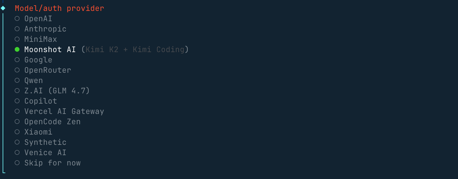 接下来我们需要配置一个大模型,Model/Auth Provider 选择 AI 供应商,国内外的供应商基本都支持。