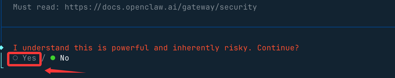 然后,会提醒你这个龙虾能力很强,当然风险也很大,我们选 yes(no 就不安装了) 就好了: