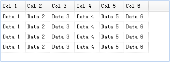 <table id="tt" class="easyui-datagrid" style="width:400px;height:auto;"> <thead> <tr> <th field="name1" width="50">Col 1</th> <th field="name2" width="50">Col 2</th> <th field="name3" width="50">Col 3</th> <th field="name4" width="50">Col 4</th> <th field="name5" width="50">Col 5</th> <th field="name6" width="50">Col 6</th> </tr> </thead> <tbody> <tr> <td>Data 1</td> <td>Data 2</td> <td>Data 3</td> <td>Data 4</td> <td>Data 5</td> <td>Data 6</td> </tr> <tr> <td>Data 1</td> <td>Data 2</td> <td>Data 3</td> <td>Data 4</td> <td>Data 5</td> <td>Data 6</td> </tr> <tr> <td>Data 1</td> <td>Data 2</td> <td>Data 3</td> <td>Data 4</td> <td>Data 5</td> <td>Data 6</td> </tr> <tr> <td>Data 1</td> <td>Data 2</td> <td>Data 3</td> <td>Data 4</td> <td>Data 5</td> <td>Data 6</td> </tr> </tbody> </table>
