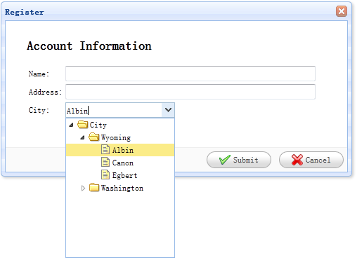 在本教程中,我们将要创建一个注册表单,带有 name、address、city 字段。city 字段是一个树形下拉框(ComboTree)字段,在里面用户可以下拉树面板(tree panel),并选择一个特定的城市。