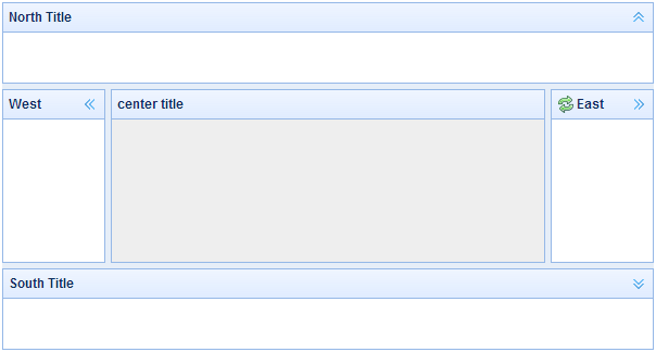 布局(layout)是有五个区域(北区 north、南区 south、东区 east、西区 west 和中区 center)的容器。中间的区域面板是必需的,边缘区域面板是可选的。每个边缘区域面板可通过拖拽边框调整尺寸,也可以通过点击折叠触发器来折叠面板。布局(layout)可以嵌套,因此用户可建立复杂的布局。