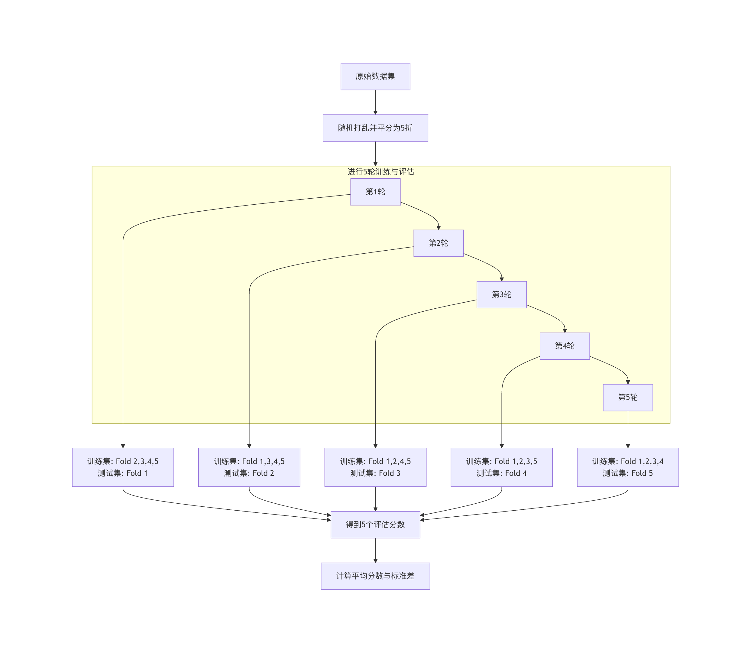 每次实验,轮流将其中一个子集作为测试集,剩下的 K-1 个子集作为训练集。这个过程重复 K 次,确保每个子集都被用作一次测试集。最终,我们得到 K 个评估分数,取其平均值作为模型的最终性能估计。