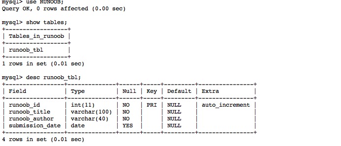 以下例子中我们将在 RUNOOB 数据库中创建数据表 runoob_tbl: